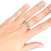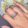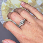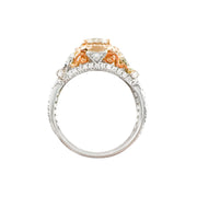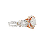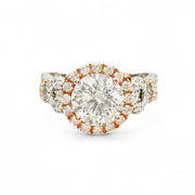 Set in warm 14ct rose gold, this stunning design features a central 1.21ct round brilliant cut diamond in a classic four-claw setting. The central diamond is framed by a double row of diamonds on the band, creating a radiant, eye-catching design. The split shoulders feature intricate scrollwork, adding a touch of refined, romantic detail.